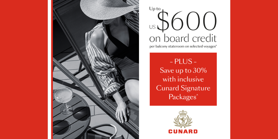 Let Cunard treat you to up to $600 onboard credit to indulge in a host of extraordinary experiences. Book selected voyages at the Cunard Fare to enjoy this offer. Plus, we’re delighted to introduce their new Cunard Signature Packages—inclusive collections crafted for effortless holidays. Save up to 30% and enjoy drinks, Wi-Fi, and dining credit to use in their alternative restaurants.