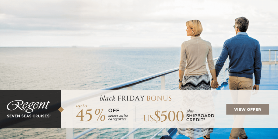 Enjoy early access to Regent Seven Seas Black Friday Bonus of Up to 45% Savings and a $500 Shipboard Credit per suite for a limited time. There’s never been a better time to fully experience all-inclusive, unrivalled luxury aboard Regent Seven Seas Cruises.